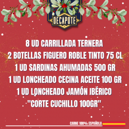 Lote Navidad para 8 Personas Este Lote está compuesto por: -8 ud Carrillada ternera -2 Botellas Figuero Roble Tinto 75cl -1 ud Sardina Ahumada 500gr -1 ud Loncheado Cecina Aceite 100gr -1 ud Lonch Jamón Ibérico "corte cuchillo 100gr" (para 8 personas aprox) ¡FELICES FIESTAS!