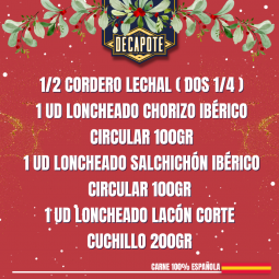 Lote Navidad PREMIUM para 4-6 Personas Este Lote está compuesto por: -1/2 Cordero Lechal (dos 1/4) -1 Ud Loncheado Chorizo Ibérico circular 100gr -1 ud Loncheado salchichón Ibérico Circular 100gr -1 ud Loncheado Lacon Corte cuchillo 200gr (para 4-6 personas aprox) ¡FELICES FIESTAS!