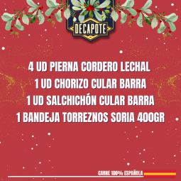Lote Navidad ECONÓMICO para 6-8 Personas Este Lote está compuesto por: -4 ud Pierna cordero Lechal -1 Ud Chorizo cular Barra -1 ud Salchichón cular Barra -1 Bandeja Torrezno Soria 400gr (para 6-8 personas aprox) ¡FELICES FIESTAS!