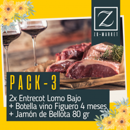 Pack-3 del Día de la Madre - Dos entrecot lomo bajo 300 gr aprox. / Ud - Una botella de vino Figuero 4 meses - Una bandeja de jamón de bellota loncheado de 80 gr ¡ Feliz Día de la Madre !
