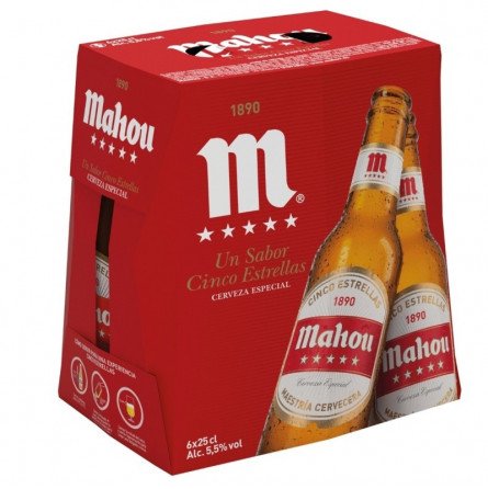 Pack de 6 botellines de 25cl de cerveza Mahou Especial Cinco Estrellas. El complemento que no puede faltar en una buena barbacoa.